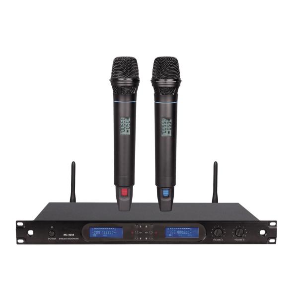 9008 wireless microphone system is a professional dual channel wireless microphone design for users who require professional performance . The system delivers perfect sound by using low interference UHF frequency band, and it is strong and reliable to meet various usages from small show to home use.